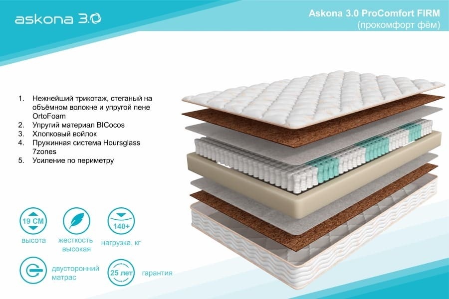 Матрас Askona ProComfort Firm, 140x200x19 см, чехол трикотаж
